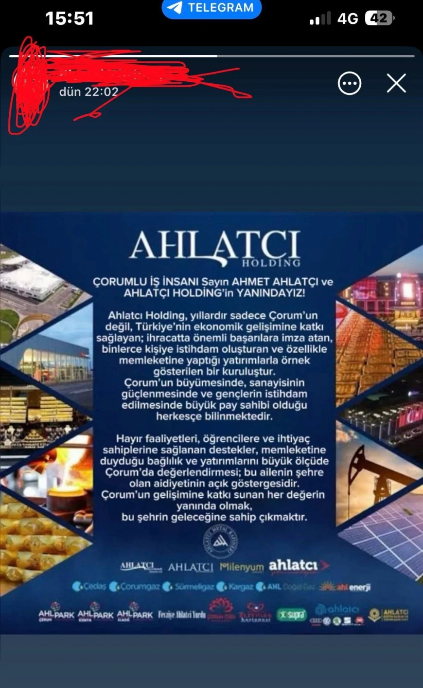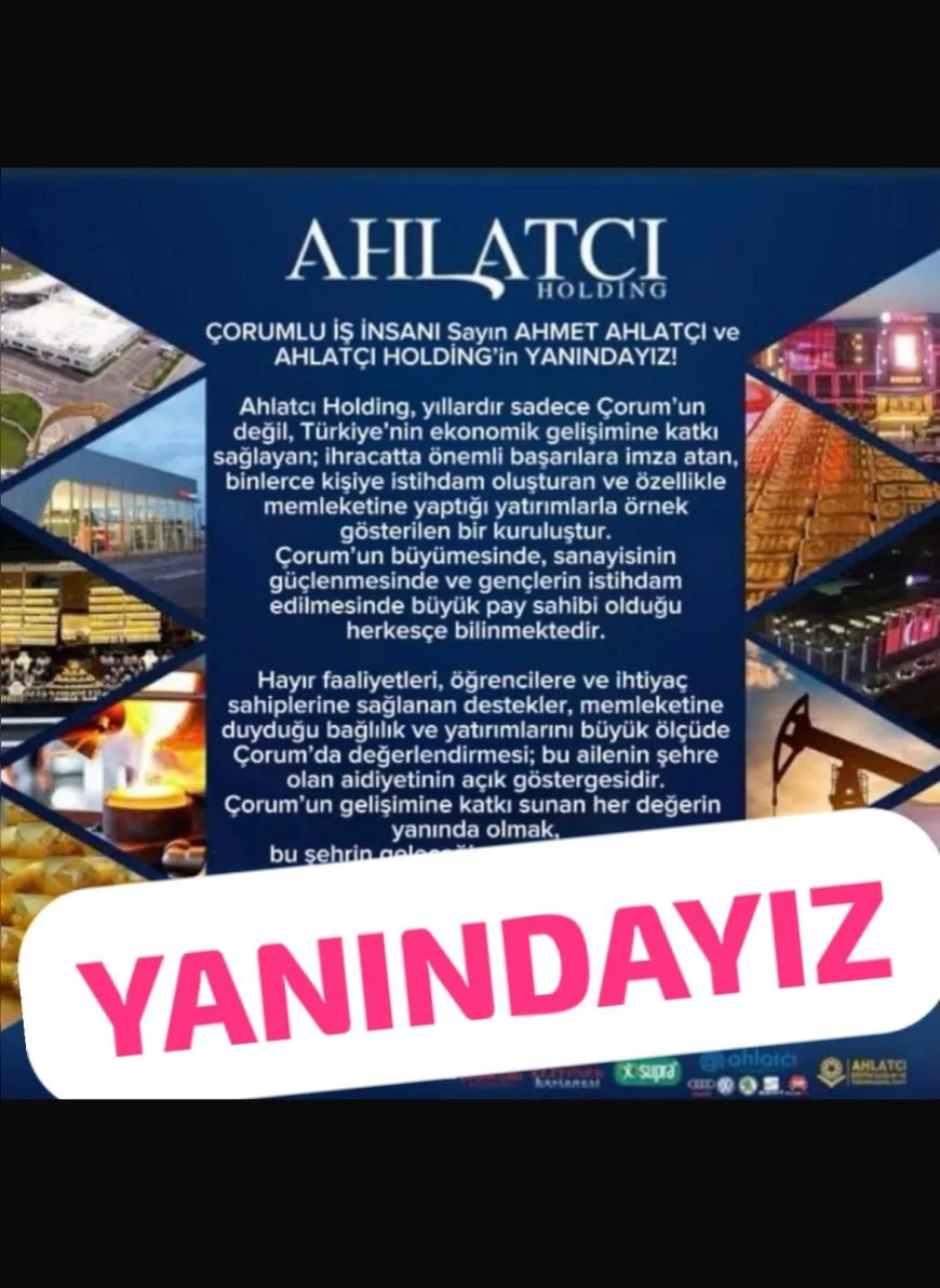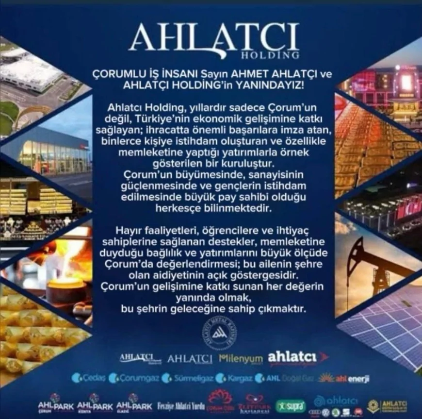 Çorum merkezli faaliyet gösteren Ahlatcı Holding ve Yönetim Kurulu Başkanı Ahmet Ahlatcı hakkında sosyal medya platformlarında gündeme gelen iddialar sonrası kent genelinde destek paylaşımları arttı. Özellikle Çorumlu vatandaşlar ve iş dünyası temsilcileri, sosyal medya hesaplarından dayanışma mesajları yayımladı.