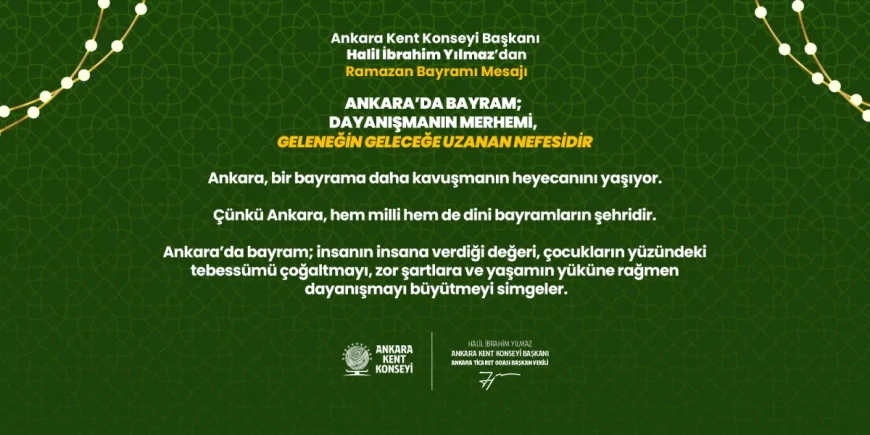 Ankara Kent Konseyi Başkanı Halil İbrahim Yılmaz, Ramazan Bayramı dolayısıyla yayımladığı mesajda Ankara’daki bayram kültürünün dayanışma, paylaşma ve geleneklerin yaşatılmasıyla anlam kazandığını vurguladı. Yılmaz, vatandaşlara trafik kurallarına uyma çağrısı yaparak bayramların ayrılık değil kavuşma günü olduğunu belirtti.
