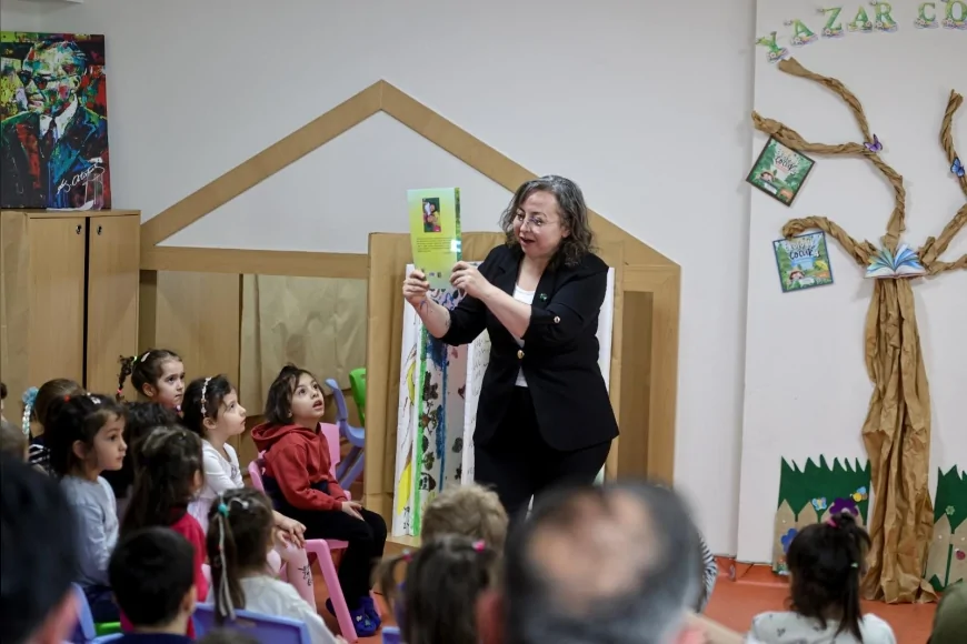 Okul öncesi öğretmeni Nilay Yücel, depremde hayatını kaybeden kızlarının anısını yaşatmak amacıyla kaleme aldığı “Vera & Lena Doğada Neler Oluyor?” adlı kitabı çocuklara okudu. Aynı zamanda 22 öğrencisi bulunan bir okul öncesi öğretmeni olduğunu belirten Yücel, depremi ve doğa olaylarını çocukların anlayabileceği bir dil ve hikâye anlatımıyla anlattı.