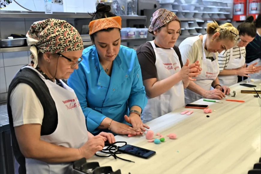 Bornova Belediyesi Mutfak Atölyesi’nde gerçekleştirilen “Temel Pastacılık Eğitimi” kapsamında katılımcılara şeker hamuru figür yapımı, pandispanya hazırlama, krema yapımı, sıvama ve süsleme teknikleri öğretiliyor. Nisan ayı boyunca Pazartesi ve Salı günleri düzenlenen eğitimler, sabah ve öğle gruplarıyla dört hafta sürüyor.