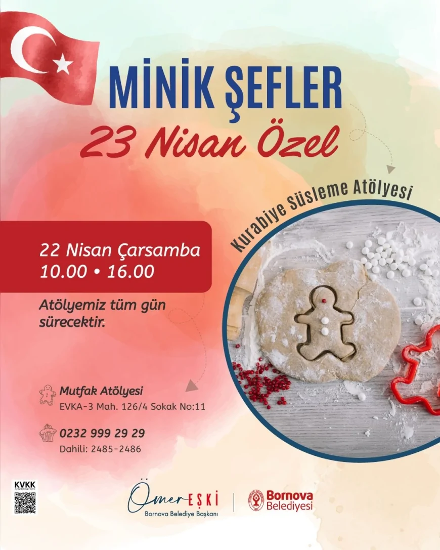 Bornova Belediyesi, 23 Nisan Ulusal Egemenlik ve Çocuk Bayramı kapsamında 22 Nisan’da “Kurabiye Süsleme Atölyesi” düzenleyecek. Gün boyu sürecek etkinlikte çocuklar kendi kurabiyelerini tasarlayıp süsleyerek hem eğlenecek hem de üretim sürecine katılacak.