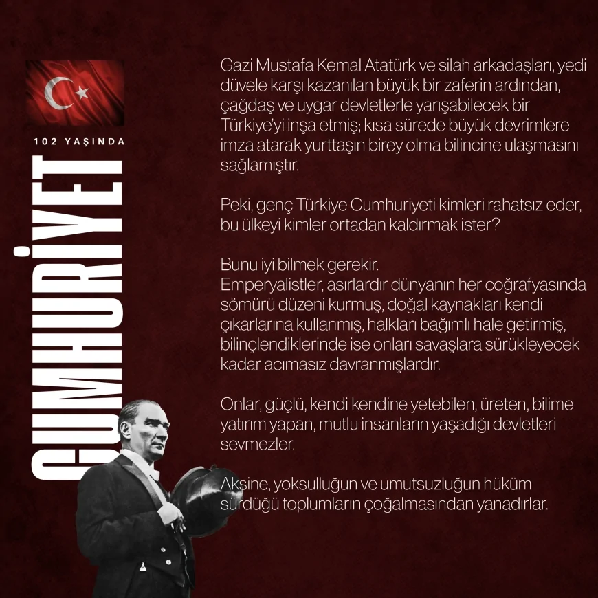 Yazısında, Cumhuriyet’in halkın kendi iradesiyle şekillenen bir yönetim biçimi olduğunu vurgulayan Ercengiz, “Cumhuriyetin gerçek sahibi doğrudan halktır.” dedi. Atatürk ve silah arkadaşlarının, yedi düvele karşı kazanılan büyük zaferin ardından çağdaş bir Türkiye inşa ettiklerini hatırlattı.