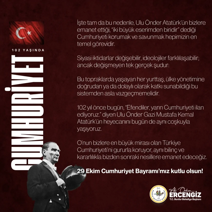 Burdur Belediye Başkanı Ali Orkun Ercengiz, Cumhuriyet’in 102. yılı dolayısıyla kaleme aldığı yazıda, 29 Ekim’in yalnızca bir bayram değil, bir milletin yeniden doğuşunun simgesi olduğunu dile getirdi.