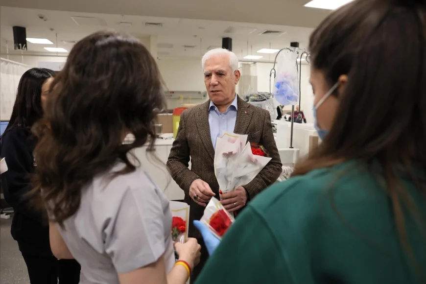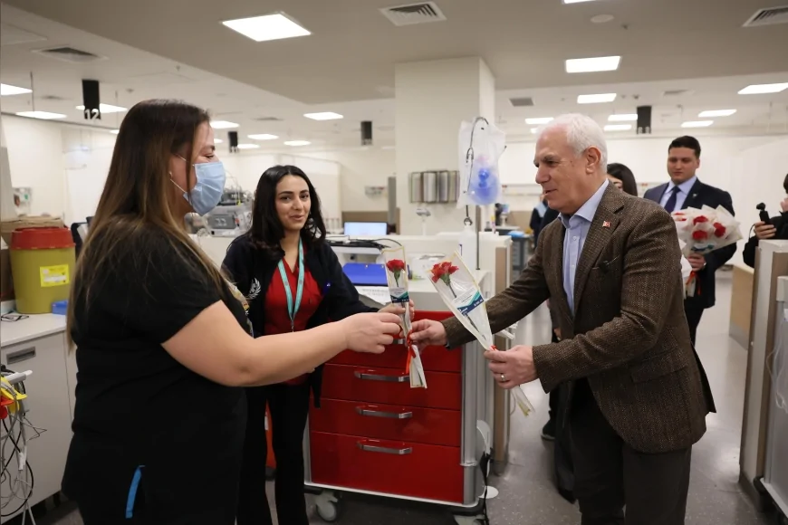 Program kapsamında ilk olarak Bursa Şehir Hastanesi yönetimiyle görüşen Başkan Bozbey, daha sonra sağlık çalışanlarını görev yaptıkları birimlerde ziyaret ederek Tıp Bayramlarını kutladı ve karanfil takdim etti.