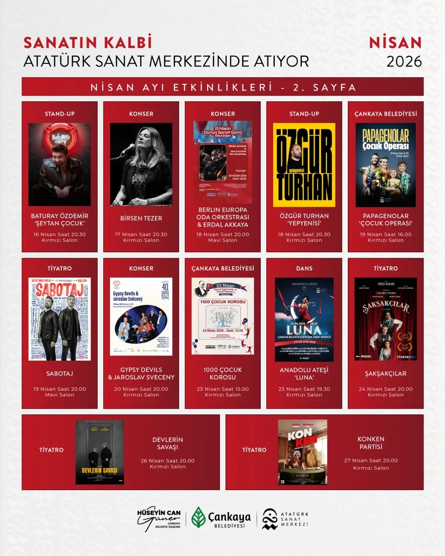 Çankaya Belediyesi’nin Başkent’in kültür ve sanat yaşamına kazandırdığı Atatürk Sanat Merkezi, nisan ayı boyunca farklı disiplinlerden etkinliklerle sanatseverleri bir araya getirecek. 500 kişilik Mavi Salon ve 1000 kişilik Kırmızı Salon, ay boyunca tiyatrodan operaya, konserlerden stand-up gösterilerine kadar geniş bir yelpazede programa ev sahipliği yapacak.