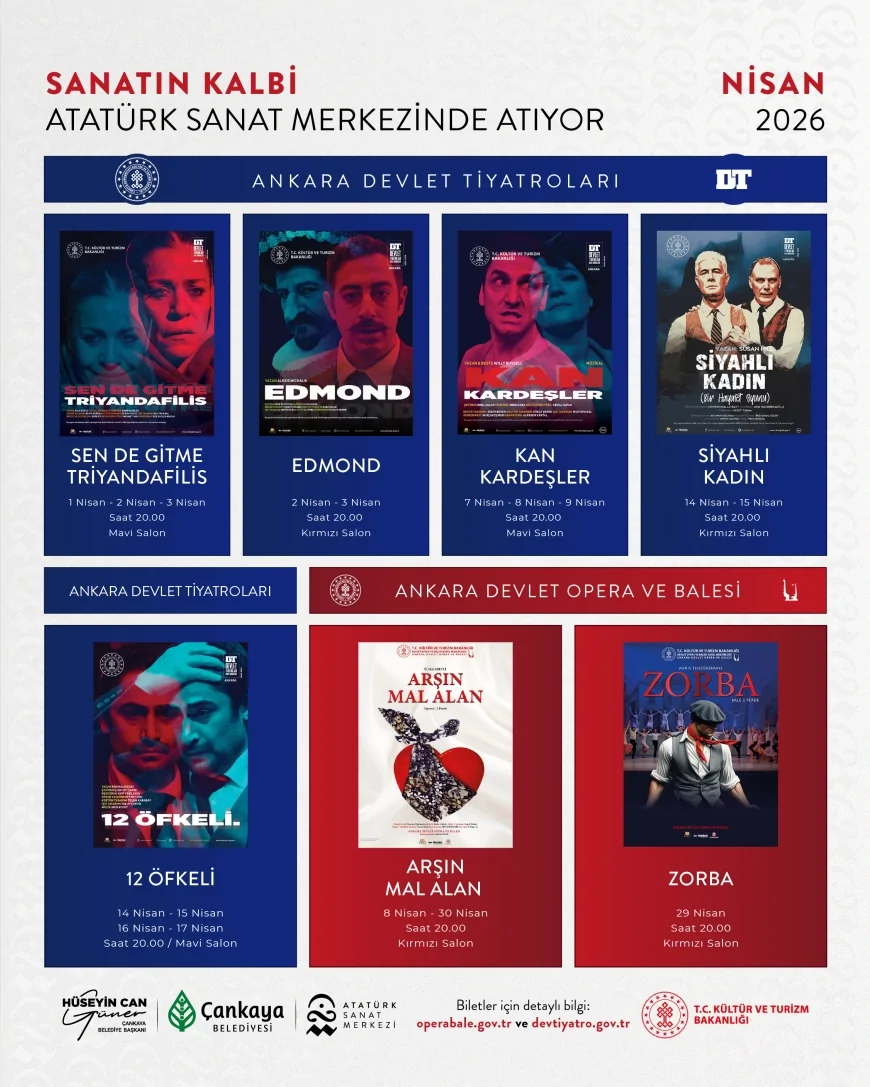 Ankara Devlet Tiyatroları ve Ankara Devlet Opera ve Balesi, nisan ayında sahneleyecekleri yapımlarla sanat merkezinin programında yer alacak. Yetkililer, “Devlet tiyatroları ve opera-bale yapımları sanatseverlerle buluşacak.” açıklamasında bulundu. Biletlerin operabale.gov.tr ve devtiyatro.gov.tr adreslerinden temin edilebildiği belirtildi.