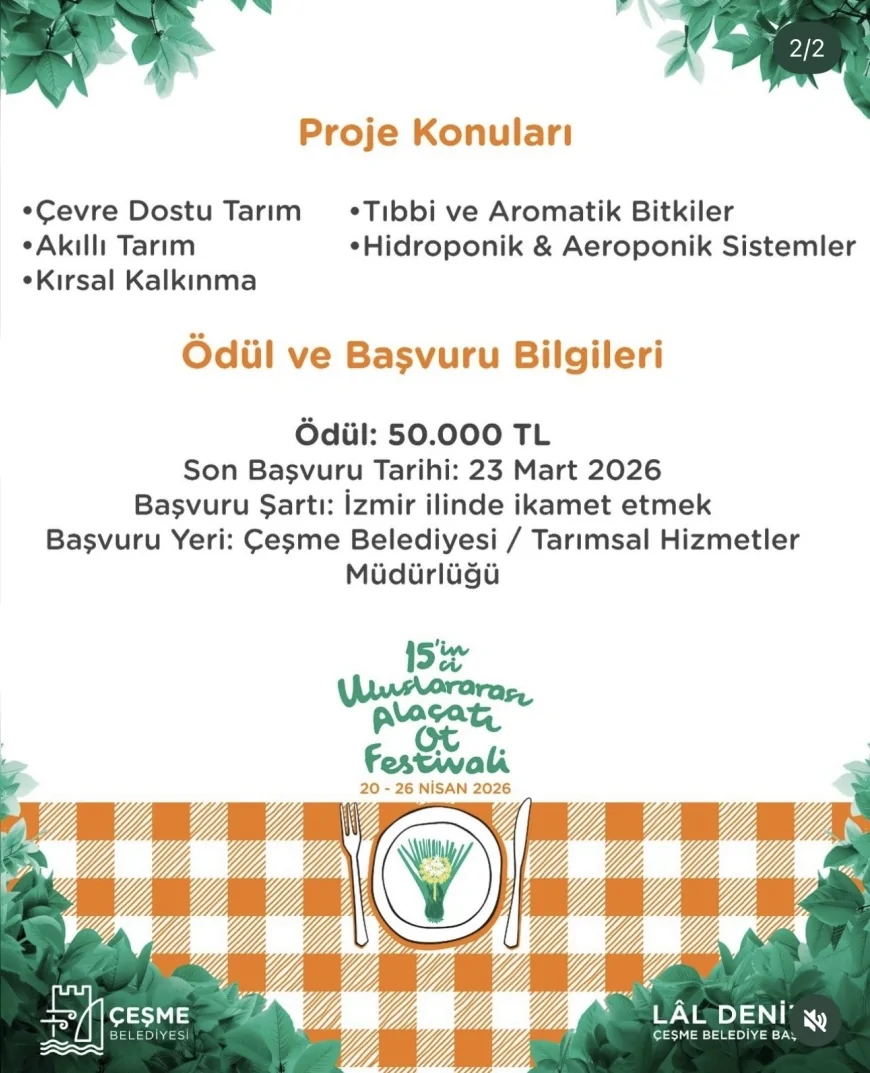 İzmir’in Çeşme ilçesinde, Çeşme Belediyesi tarafından bu yıl 15’incisi düzenlenen Uluslararası Alaçatı Ot Festivali kapsamında gerçekleştirilen “Sürdürülebilir Tarım Proje Yarışması” için ön değerlendirme süreci tamamlandı. Yarışmaya başvuran projelerin, sürdürülebilir tarım, akıllı üretim ve kırsal kalkınmaya katkı sunma hedefiyle hazırlandığı bildirildi.