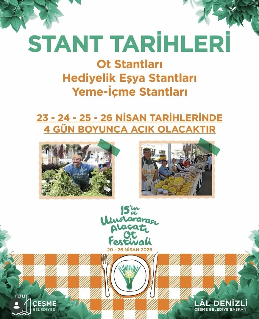 Çeşme Belediyesi tarafından bu yıl 15’incisi düzenlenen Uluslararası Alaçatı Ot Festivali, 20-26 Nisan 2026 tarihleri arasında İzmir’in Alaçatı Mahallesi’nde başladı. “Köklerden Dünya’ya” temasıyla gerçekleştirilen festival, yerel bitki çeşitliliğini ve gastronomi kültürünü ön plana çıkarıyor.