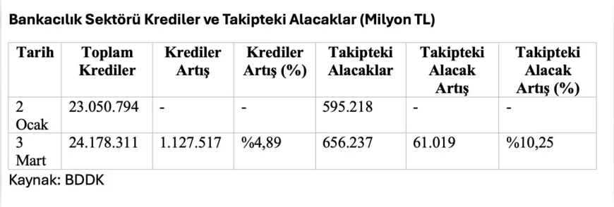 Karabat’ın paylaştığı verilere göre bankacılık sektöründe toplam kredi hacmi yılın ilk iki ayında önemli ölçüde yükseldi. BDDK verilerine göre 2 Ocak’ta 23 trilyon 50 milyar TL olan toplam kredi hacmi, 3 Mart itibarıyla 24 trilyon 178 milyar TL’ye çıktı. İki aylık dönemde kredi hacmi 1 trilyon 127 milyar TL artarken büyüme oranı yaklaşık yüzde 4,89 oldu.