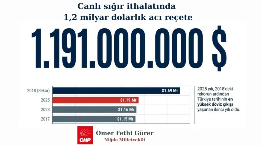 CHP Niğde Milletvekili Ömer Fethi Gürer, Türkiye’nin 2016–2025 dönemine ilişkin canlı sığır ithalat verilerini değerlendirerek 2025 yılında 739 bin baş hayvan için 1 milyar 191 milyon dolar ödendiğini açıkladı. Gürer, ithal edilen hayvan sayısının azalmasına rağmen döviz faturasının yükseldiğini belirterek, ithalatın et fiyatlarını düşürmediğini ve hayvancılıkta dışa bağımlılığı artırdığını söyledi.
