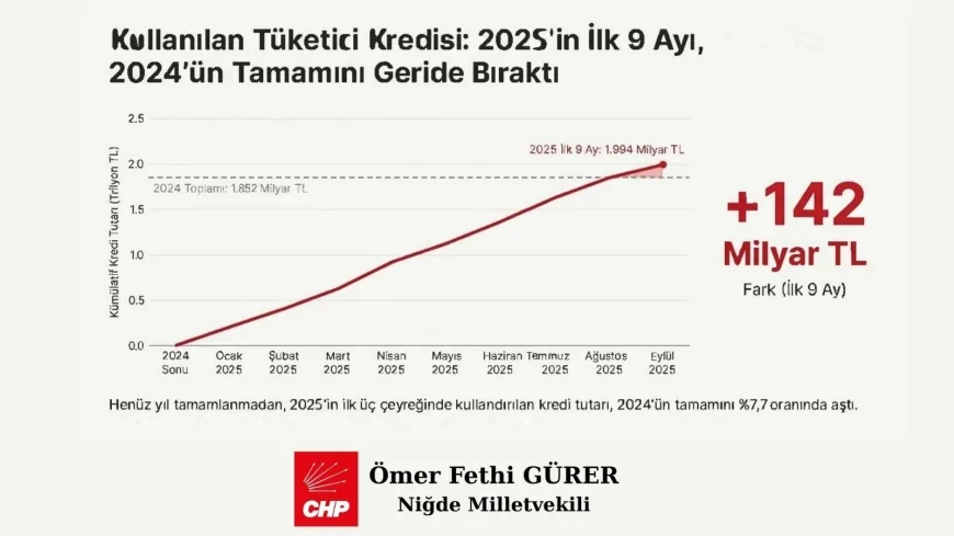 Ömer Fethi Gürer, 2024 yılında toplam kullandırılan tüketici kredisi tutarının 1 trilyon 852 milyar TL olduğunu, 2025 yılının ilk 9 ayında bu rakamın 1 trilyon 994 milyar 394 milyon TL’ye çıktığını belirtti. Böylece sadece 9 ayda, 2024 yılının tamamının 142 milyar 394 milyon TL üzerine çıkıldığını kaydeden Gürer, artış oranının yaklaşık yüzde 7,7 olduğunu açıkladı.