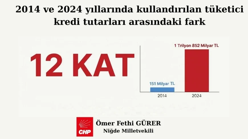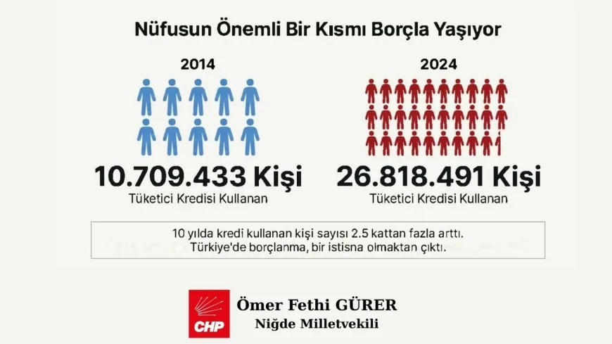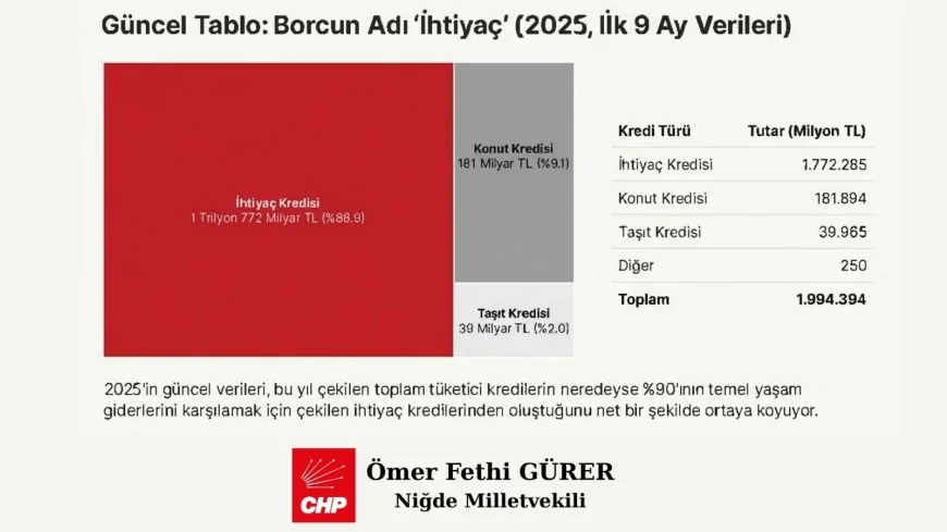 CHP Niğde Milletvekili Ömer Fethi Gürer, Türkiye Bankalar Birliği’nin son 10 yıllık kredi verilerini karşılaştırmalı analizle değerlendirdi. Konut kredilerinin payının sert biçimde düştüğünü, ihtiyaç kredilerinin ise rekor seviyeye çıktığını belirten Gürer, borçlanmanın yatırımdan hayatta kalma aracına dönüştüğünü söyledi.