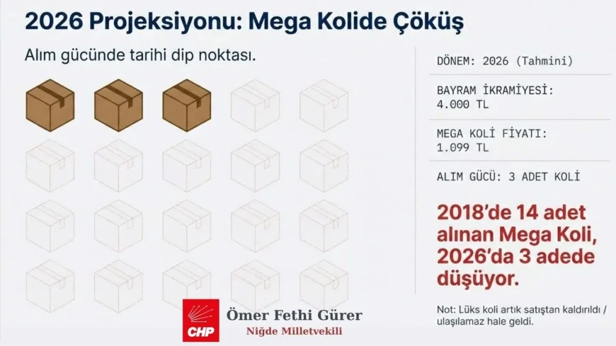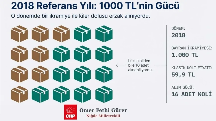 CHP Niğde Milletvekili Ömer Fethi Gürer, 2018–2026 yılları arasında emekli bayram ikramiyesinin alım gücünü Ramazan kolisi fiyatları üzerinden değerlendirdi. Gürer, 2018’de 1000 TL ikramiye ile 14–16 koli alınabildiğini, 2026’da ise 4000 TL ikramiye ile mega kolide alım gücünün 3 adede kadar gerilediğini belirterek emeklinin reel kaybının yüzde 78’e ulaştığını açıkladı.