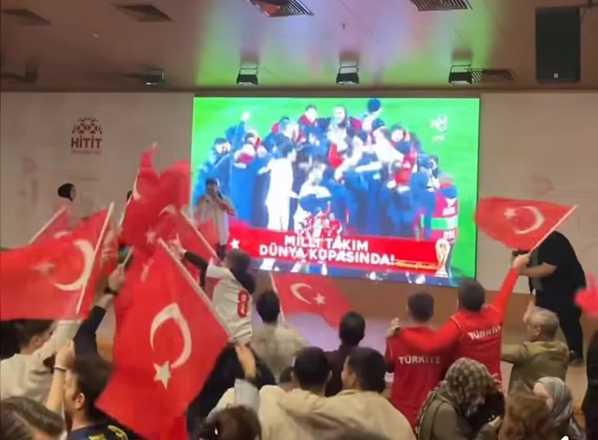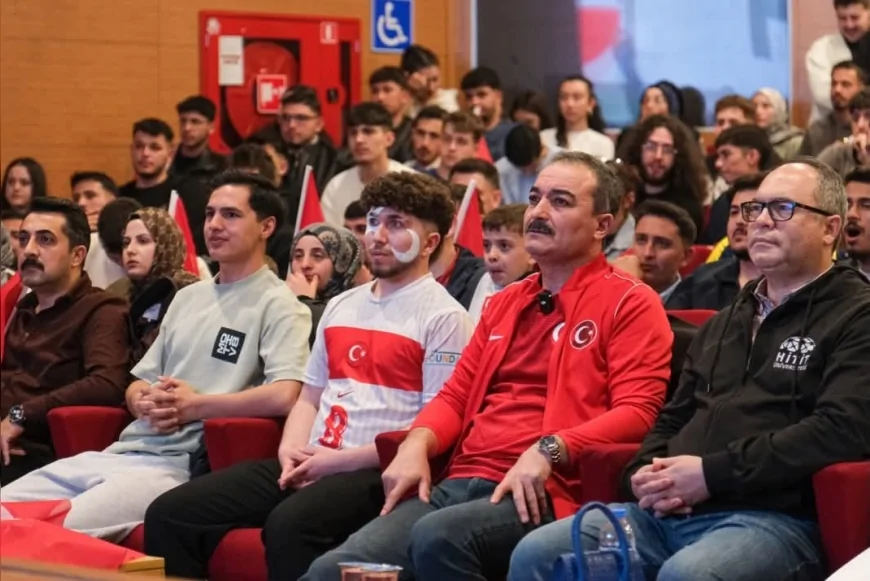 Çorum Hitit Üniversitesi Meslek Yüksekokulu kampüsünde, A Milli Futbol Takımı’nın Dünya Kupası karşılaşması için öğrencilerin katılımıyla toplu izleme etkinliği düzenlendi. 31 Mart 2026 tarihinde saat 21.45’te Ethem Erkoç Konferans Salonu’nda gerçekleştirilen etkinlikte öğrenciler milli heyecana ortak oldu.