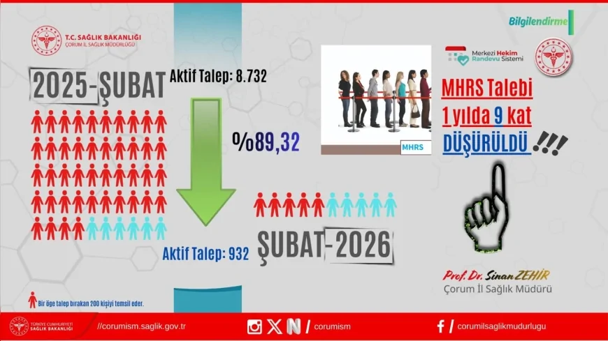 T.C. Sağlık Bakanlığı Kamu Hastaneleri Genel Müdürlüğü koordinasyonunda Çorum İl Sağlık Müdürlüğü tarafından yürütülen çalışmalar sonucunda, 2025 Şubat ayında 8 bin 732 olan MHRS aktif talep sayısının 2026 Şubat ayında 932’ye gerilediği açıklandı. İl Sağlık Müdürü Prof. Dr. Sinan Zehir, randevu sisteminde talep yoğunluğunun önemli ölçüde azaltıldığını belirterek sürecin detaylarını paylaştı.
