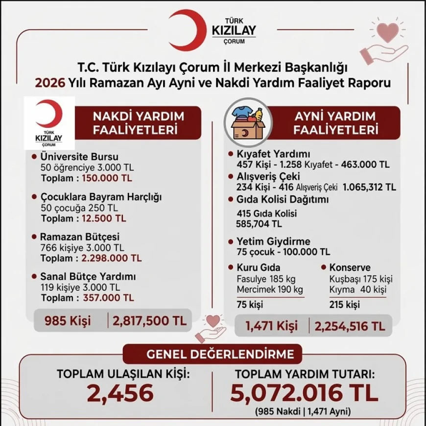 Çorum Kızılay İl Başkanlığı, 2026 yılı Ramazan ayında gerçekleştirdiği kapsamlı yardım çalışmalarıyla ihtiyaç sahiplerine destek sağladı. İl genelinde yürütülen faaliyetlerde hem ayni hem de nakdi yardımlar geniş bir kesime ulaştırıldı. Toplam yardım tutarının 5 milyon lirayı aştığı bildirildi.