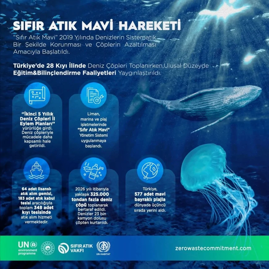 Paylaşılan görselde yer alan bilgilere göre, “Sıfır Atık Mavi” hareketinin 2019 yılında denizlerin korunması ve deniz çöpünün azaltılması amacıyla başlatıldığı belirtildi. Türkiye genelinde 28 kıyı ilinde deniz çöplerinin toplandığı ve ulusal düzeyde eğitim ile bilinçlendirme faaliyetlerinin yaygınlaştırıldığı ifade edildi.
