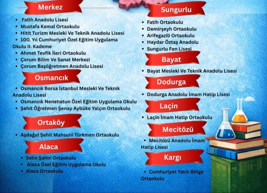 TÜBİTAK 4006 Bilim Fuarları Destekleme Programı kapsamında, Çorum genelinde toplam 24 okulun projesi desteklenmeye hak kazandı. Başarının, il genelinde bilim temelli eğitimin güçlendiğinin somut göstergesi olduğu belirtildi.