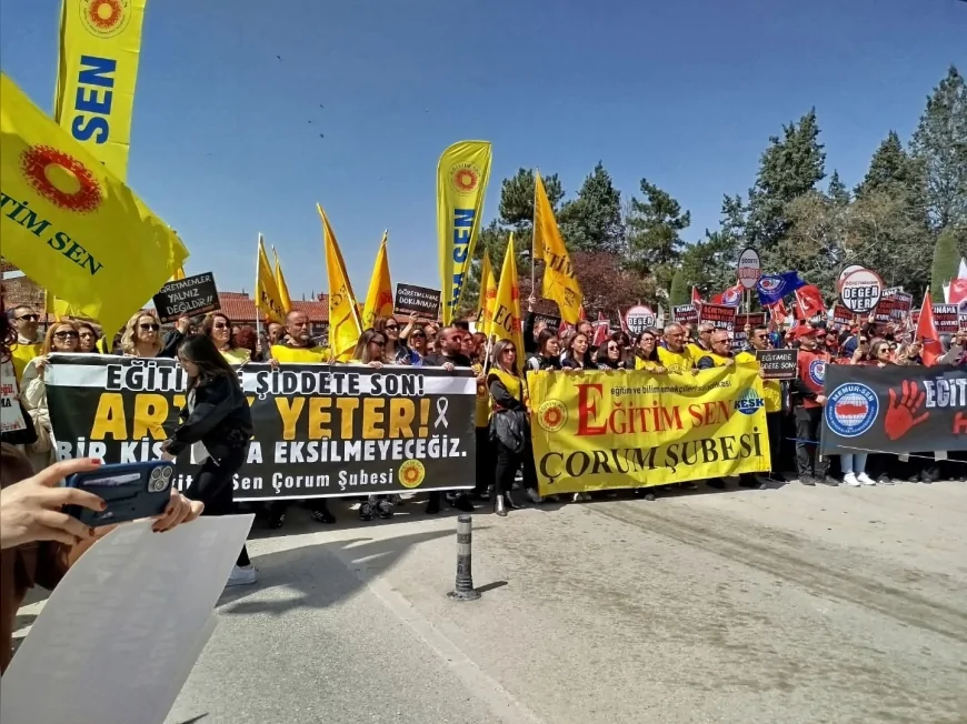 Çorum’da 15 Nisan’da çok sayıda eğitim sendikasının katılımıyla düzenlenen yürüyüşte eğitimde şiddete karşı ortak tepki ortaya konuldu. Sendikalar, 16 Nisan’da Ankara’da yapılacak büyük yürüyüşe katılmak üzere yola çıkacaklarını açıklarken, üç gün sürecek iş bırakma eylemiyle güvenli okul talebini yineledi.
