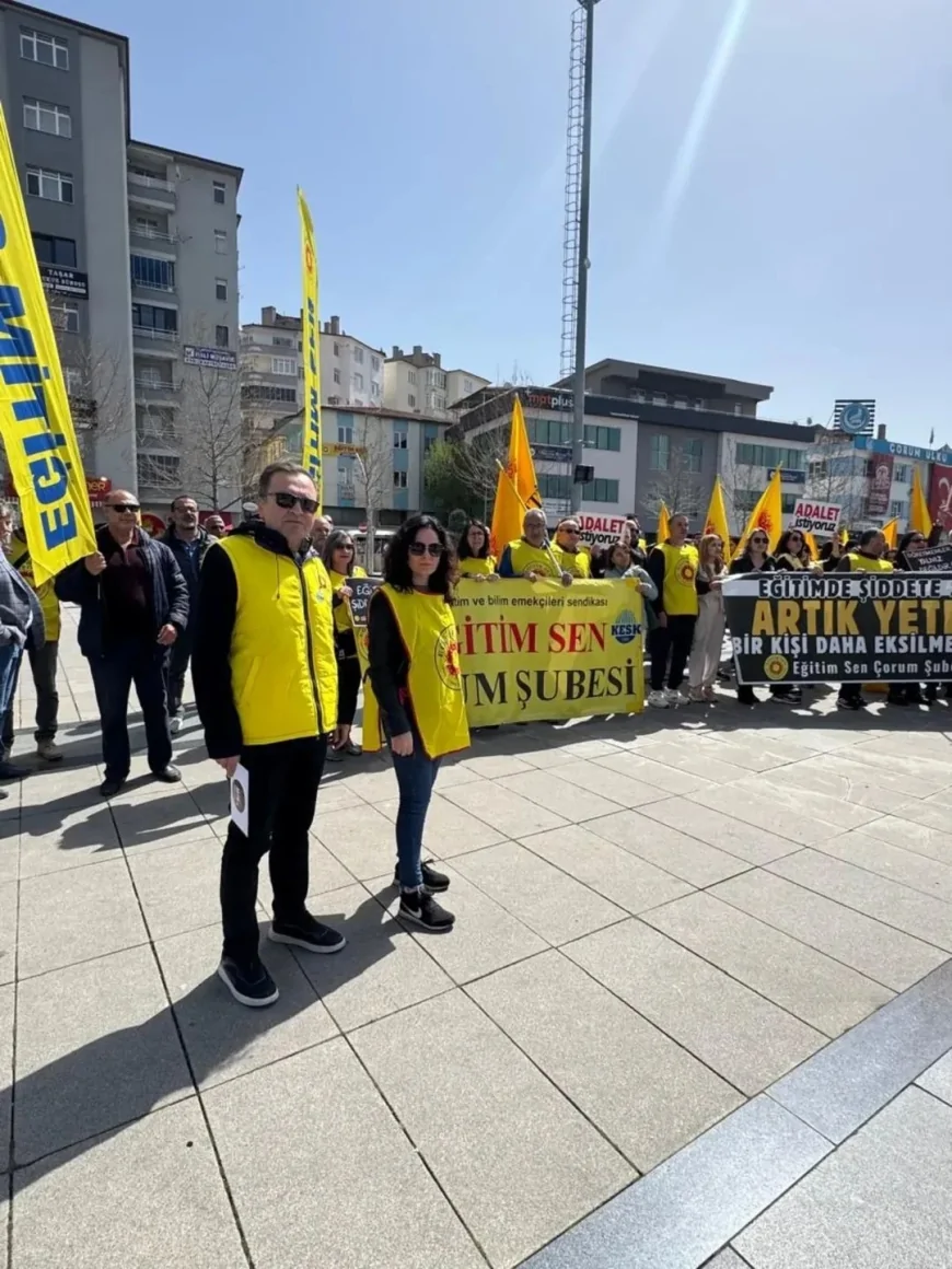 Çorum’da faaliyet gösteren Eğitim-Bir-Sen, Türk Eğitim-Sen, Eğitim-Sen, Eğitim-İş, Eğitim Gücü-Sen, Hürriyetçi Eğitim-Sen ve Anadolu Eğitim Sendikası, 15 Nisan’da iş bırakarak ortak eylem gerçekleştirdi. Kadeş Barış Meydanı’nda toplanan eğitimciler, pankart ve sloganlar eşliğinde Saat Kulesi’ne kadar yürüyerek okullarda şiddetin son bulması çağrısında bulundu.