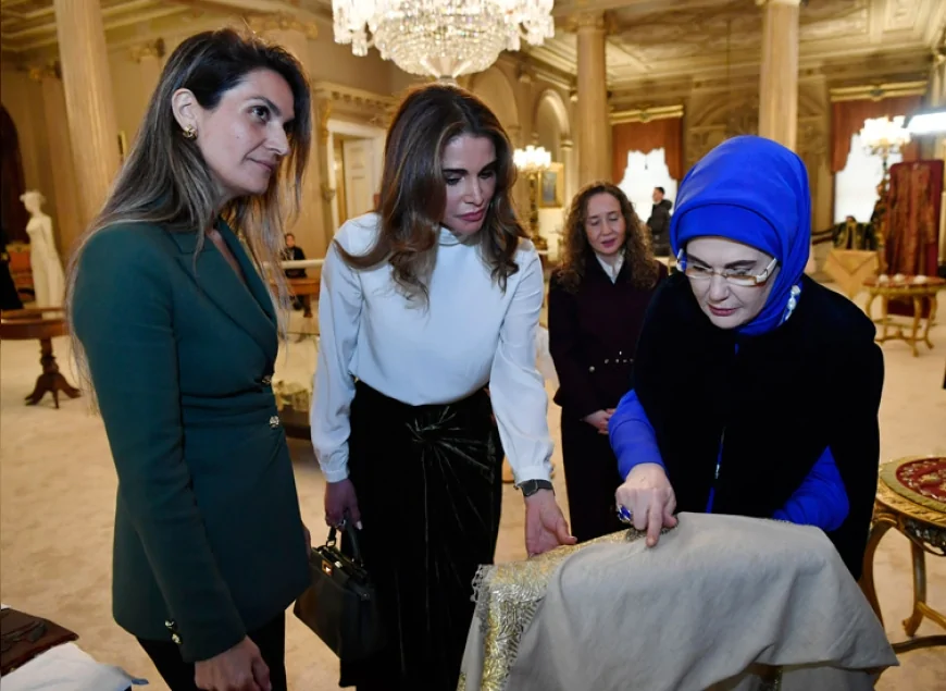 Cumhurbaşkanı Recep Tayyip Erdoğan’ın eşi Emine Erdoğan, 7 Şubat 2026’da Ürdün Kraliçesi Rania Al Abdullah ile İstanbul’daki Dolmabahçe Sarayı’nda bir araya geldi. Görüşme kapsamında “Tabiatın Ahenginden Kültürel Hafızaya: Nakş-ı Zaman Sergisi” ziyaret edilirken, iki isim Türkiye’nin geleneksel nakış sanatını yansıtan eserleri birlikte inceledi.