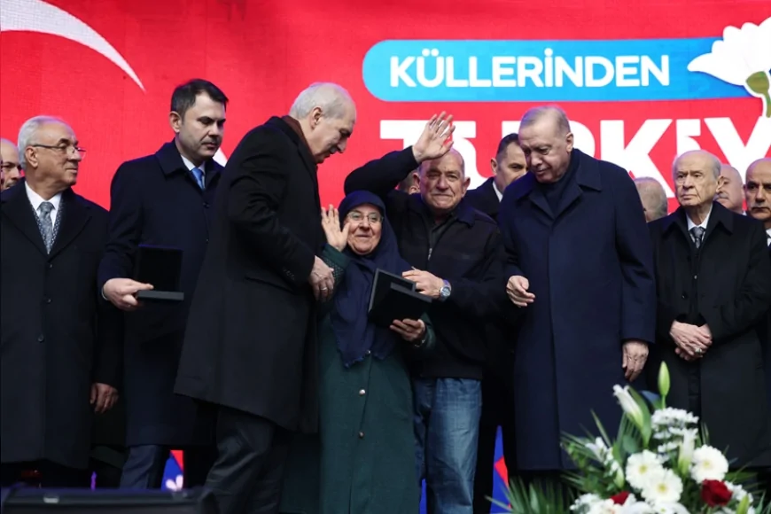 Deprem sürecinde siyasi tartışmalara rağmen çalışmaları kararlılıkla sürdürdüklerini ifade eden Erdoğan, verilen sözlerin tutulduğunu, şehirlerin kısa sürede yeniden ayağa kaldırıldığını söyledi.