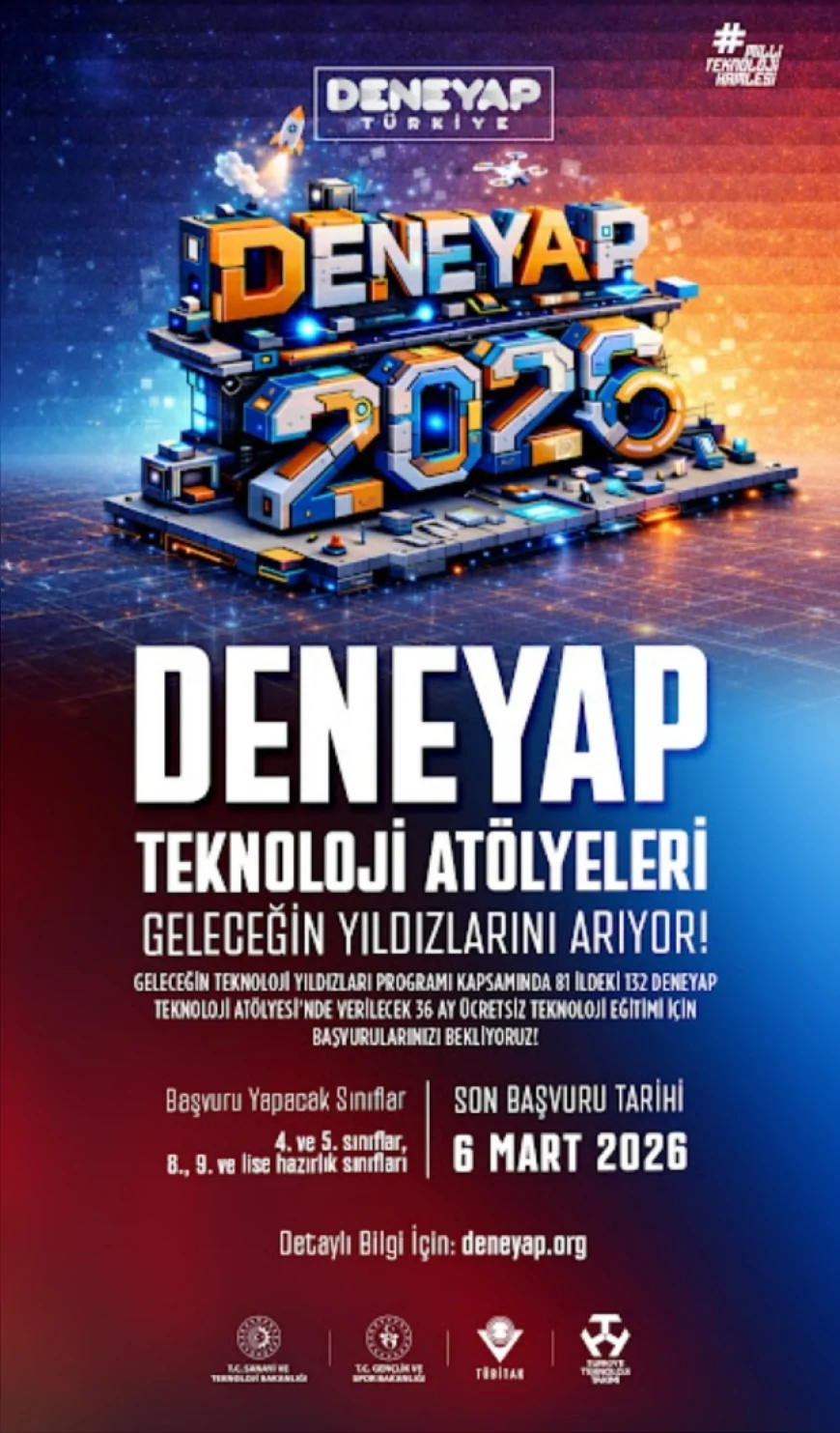 Sanayi ve Teknoloji Bakanlığı, Gençlik ve Spor Bakanlığı, TÜBİTAK ve T3 Vakfı paydaşlığında yürütülen DENEYAP Teknoloji Atölyeleri, 2026 Öğrenci Seçme Süreci başvurularını başlattı. Türkiye’nin 81 ilinde 132 atölyede ücretsiz teknoloji eğitimi almak isteyen 4, 5, 8 ve 9. sınıf ile lise hazırlık öğrencileri, çevrim içi başvuru yaparak üç aşamalı seçme sürecine katılabilecek.