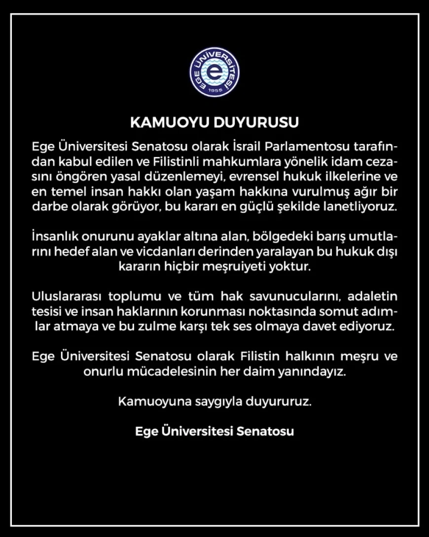 Ege Üniversitesi tarafından kamuoyuna duyurulan bildiride, “Ege Üniversitesi Senatosu olarak İsrail Parlamentosu tarafından kabul edilen ve Filistinli mahkumlara yönelik idam cezasını öngören yasal düzenlemeyi, evrensel hukuk ilkelerine ve en temel insan hakkı olan yaşam hakkına vurulmuş ağır bir darbe olarak görüyor, bu kararı en güçlü şekilde lanetliyoruz.” ifadelerine yer verildi.
