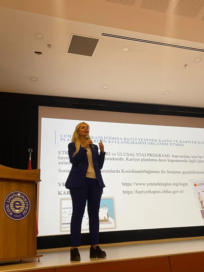 Ege Üniversitesi Kariyer Planlama Koordinatörlüğü, Cumhurbaşkanlığı İnsan Kaynakları Ofisi tarafından koordine edilen Kariyer Planlama dersi kapsamında “21. Yüzyıl Yetkinlikleri ile Geleceğin İş Dünyasına Yolculuk” başlıklı bir seminer düzenledi. İletişim Fakültesi Konferans Salonu’nda gerçekleştirilen etkinlikte, Koordinatör Öğr. Gör. Ebru Kalyoncu gençlere kariyer planlamasında yön gösterici bilgiler sundu. Seminerde, Yetenek Kapısı platformu, staj ve mentorluk imkânları, kariyer danışmanlığı hizmetleri ve iş dünyasıyla kurulan iş birlikleri detaylı biçimde paylaşıldı.