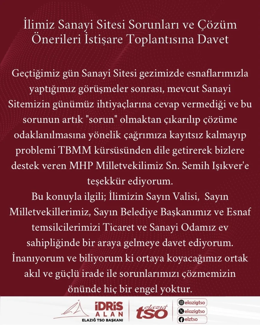 Elazığ Ticaret ve Sanayi Odası Başkanı İdris Alan, mevcut Sanayi Sitesi’nin günümüz ihtiyaçlarına cevap vermediğini belirterek sorunun çözümü için çağrıda bulundu. Alan, konuyu TBMM kürsüsünde gündeme taşıyan MHP Elazığ Milletvekili Semih Işıkver’e teşekkür ederken, Elazığ Valisi, milletvekilleri, belediye başkanı ve esnaf temsilcilerini Elazığ Ticaret ve Sanayi Odası ev sahipliğinde yapılacak ortak toplantıya davet etti.