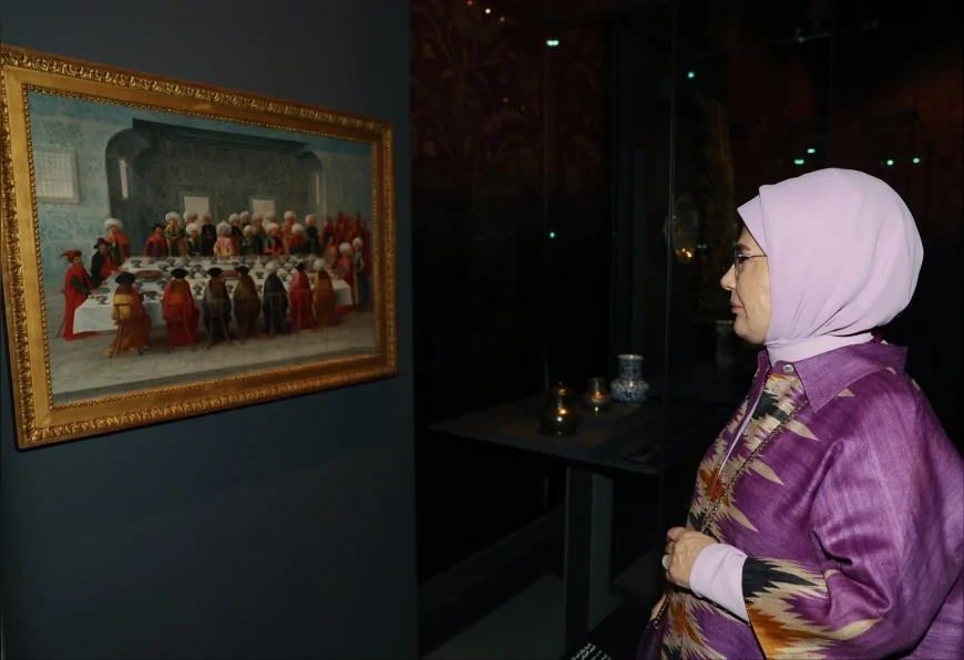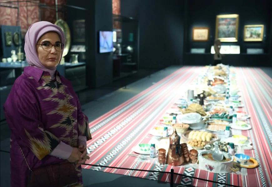 “Masada Bir Yer: İslam Dünyasında Sofra, Yemek ve Ziyafet Geleneği” adlı sergiyi gezen Emine Erdoğan, İslam dünyasındaki yemek ve sofra kültürünü yansıtan eserler hakkında detaylı bilgi aldı. Sergide, yemeğin sadece bir beslenme biçimi değil, aynı zamanda inanç, misafirperverlik ve kimlik göstergesi olarak toplumlar arası bağ kurma yönüne dikkat çekiliyor.