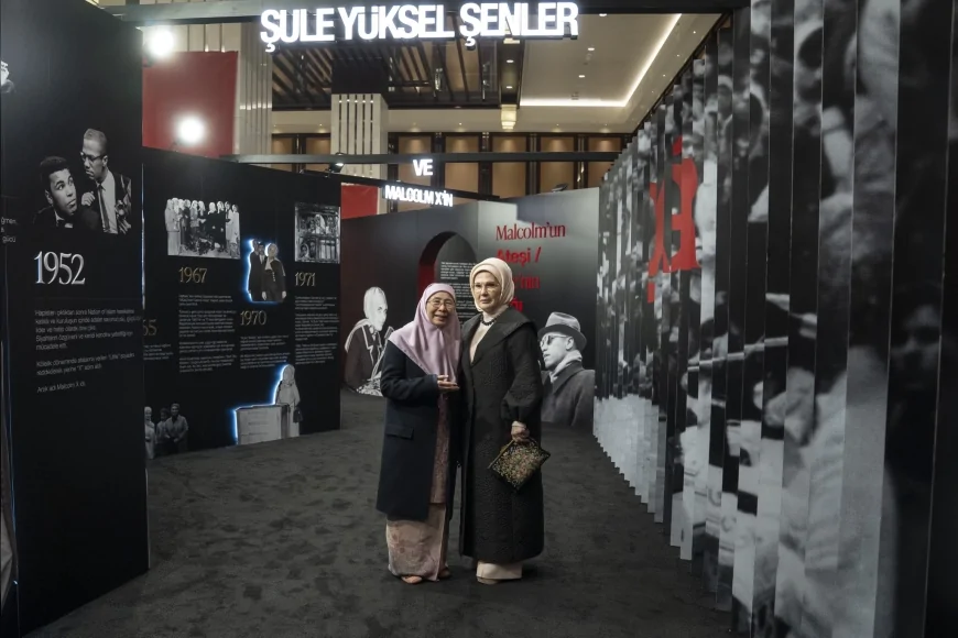 Lider eşleri, daha sonra Şule Yüksel Şenler ile Malcolm X’in hak ve özgürlük mücadelesine ışık tutan “Yankılar: Şule Yüksel Şenler ve Malcolm X’in Mirasını Yaşatmak Sergisi”ni ziyaret etti. Farklı coğrafyalarda verilen özgürlük mücadelelerinin benzer yankılarına dikkat çekilen sergide Wan Azizah İsmail, eserler hakkında bilgi aldı. Emine Erdoğan, Şule Yüksel Şenler’in “Huzur Sokağı” kitabını imzalayarak misafirine hediye etti.