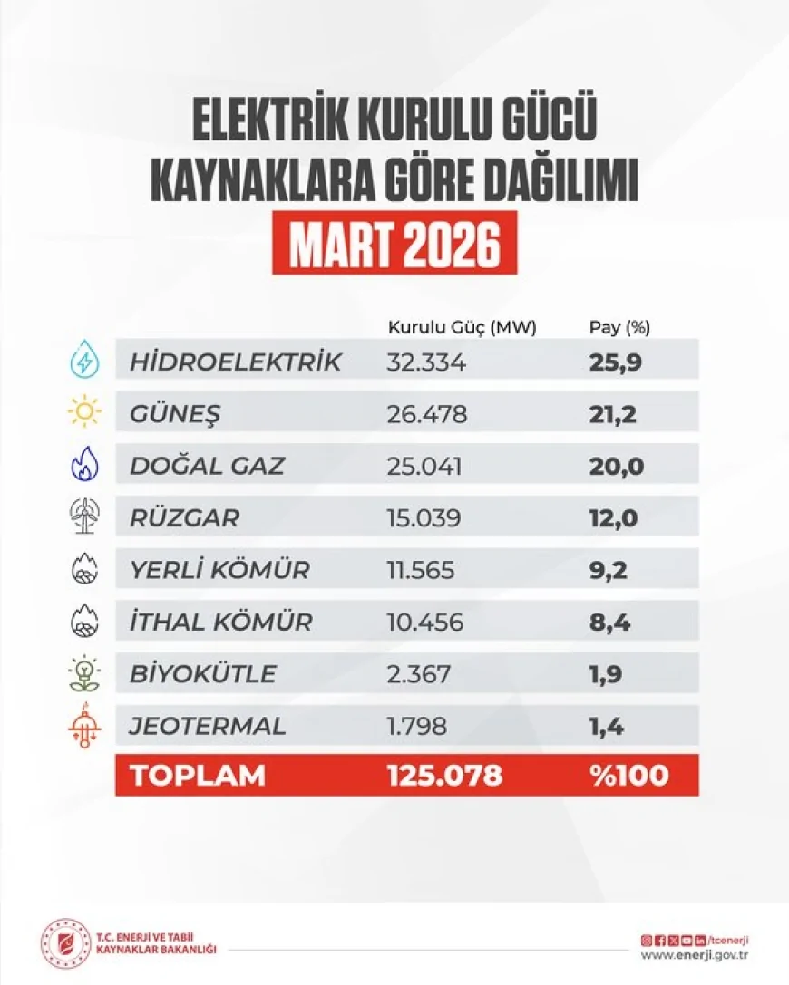 Türkiye’nin elektrik kurulu gücü, 2026 yılı mart ayı sonu itibarıyla 125 bin 78 megavata yükseldi. Enerji ve Tabii Kaynaklar Bakanlığı tarafından paylaşılan verilere göre, toplam kurulu gücün önemli bir kısmını yenilenebilir enerji kaynakları oluşturdu.