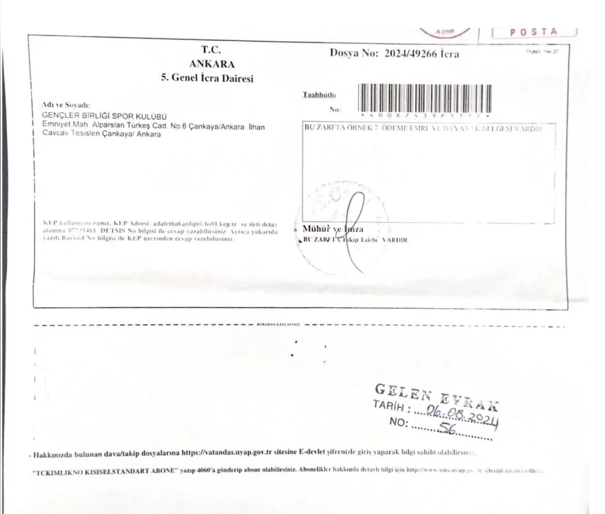 Takip evrakında, belirtilen tutarların faiz ve diğer kalemlerle birlikte tahsilinin talep edildiği yer alıyor. Tebligatın Gençlerbirliği Spor Kulübü’ne 26 Ağustos 2024 tarihinde ulaştığı görülüyor.