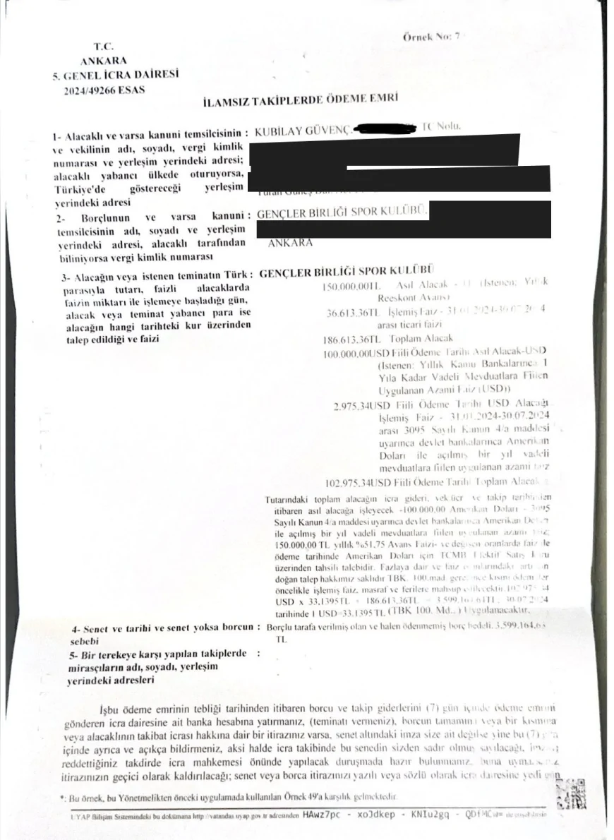 Ankara 5. Genel İcra Dairesi’nde 2024/49266 esas numarasıyla yürütülen dosyada, Güvenç’in kulübün hesabına daha önce gönderdiği 2 milyon TL tutarındaki ödemeyi “borç” olarak nitelendirdiği ve bu tutarın iadesi için yasal takip başlattığı belirtildi.
