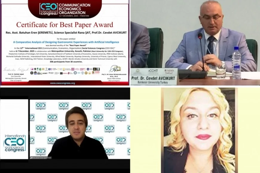 Balıkesir Üniversitesi (BAÜN) akademisyenleri ve öğrencileri, bu kez Pakistan’da düzenlenen uluslararası bir kongrede önemli bir başarı elde etti. Arş. Gör. Batuhan Eren Şeremetli, Bilim Uzmanı Rana Şat ve BAÜN Rektör Yardımcısı Prof. Dr. Cevdet Avcıkurt tarafından sunulan “A Comparative Analysis of Designing Gastronomic Experiences With Artificial Intelligence” başlıklı bildiri, 12th International CEO Social Sciences Congress’te “Best Paper Award / En İyi Bildiri” ödülüne layık görüldü.