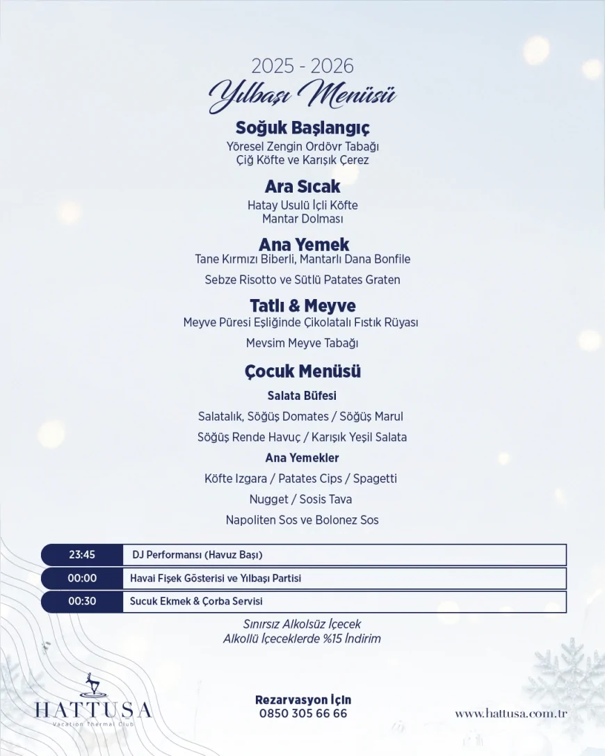 Hattuşa Ankara’nın yılbaşı menüsünde yöresel ordövr tabağı, çiğ köfte, Hatay usulü içli köfte, mantar dolması, dana bonfile, risotto, sütlü patates graten ve özel tatlılar yer alıyor. Çocuk misafirler için ayrıca özel çocuk menüsü ve salata büfesi hazırlanacak. Gece boyunca sınırsız alkolsüz içecek ikramı yapılacak, alkollü içeceklerde ise indirim uygulanacak.