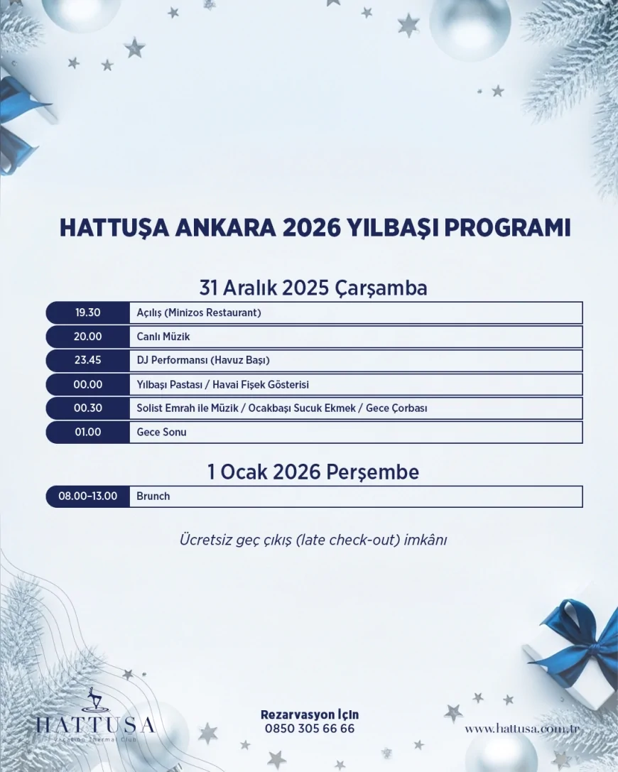 Hattuşa Ankara, 31 Aralık 2025 Çarşamba günü düzenleyeceği 2026 Yılbaşı programının detaylarını paylaştı. Canlı müzikten DJ performansına, özel yılbaşı menüsünden havai fişek gösterisine kadar birçok etkinliği kapsayan program, konaklama ve SPA indirimleriyle misafirlerini ağırlamaya hazırlanıyor.