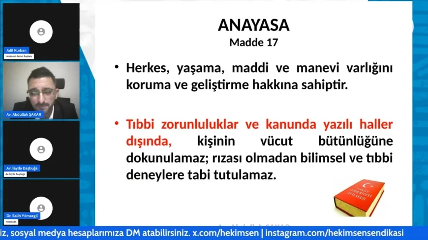 Çalıştaya Hekimsen Genel Başkanı Uzm. Dr. Adil Kurban, Hekimsen Hukuk Birimi Koordinatörü Av. Abdullah Şakar, Av. İlayda Başbuğa moderatörlüğünde ve Hekimsen Kurucu Üyesi Dr. Salih Yılmazgil’in katkılarıyla katılım sağlandı. Yayında ayrıca sağlık camiasından hekimler, hukukçular ve izleyicilerden gelen sorular ele alındı.