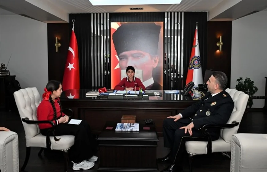 23 Nisan Ulusal Egemenlik ve Çocuk Bayramı kapsamında Hacı Bektaş Veli Ortaokulu öğrencileri İl Emniyet Müdürü Arif Pehlivan’ı makamında ziyaret etti. Gerçekleşen buluşmada çocukların bayram sevinci paylaşılırken, geleceğe dair umut ve başarı mesajları verildi.