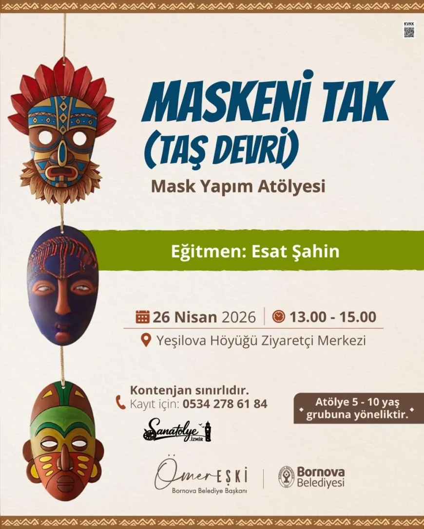 26 Nisan’da gerçekleştirilecek “Maskeni Tak (Taş Devri)” atölyesi, eğitmen Esat Şahin yönetiminde yapılacak. 5-10 yaş grubuna yönelik etkinlikte çocuklar kendi maskelerini tasarlarken tarih öncesi dönem hakkında bilgi edinecek.