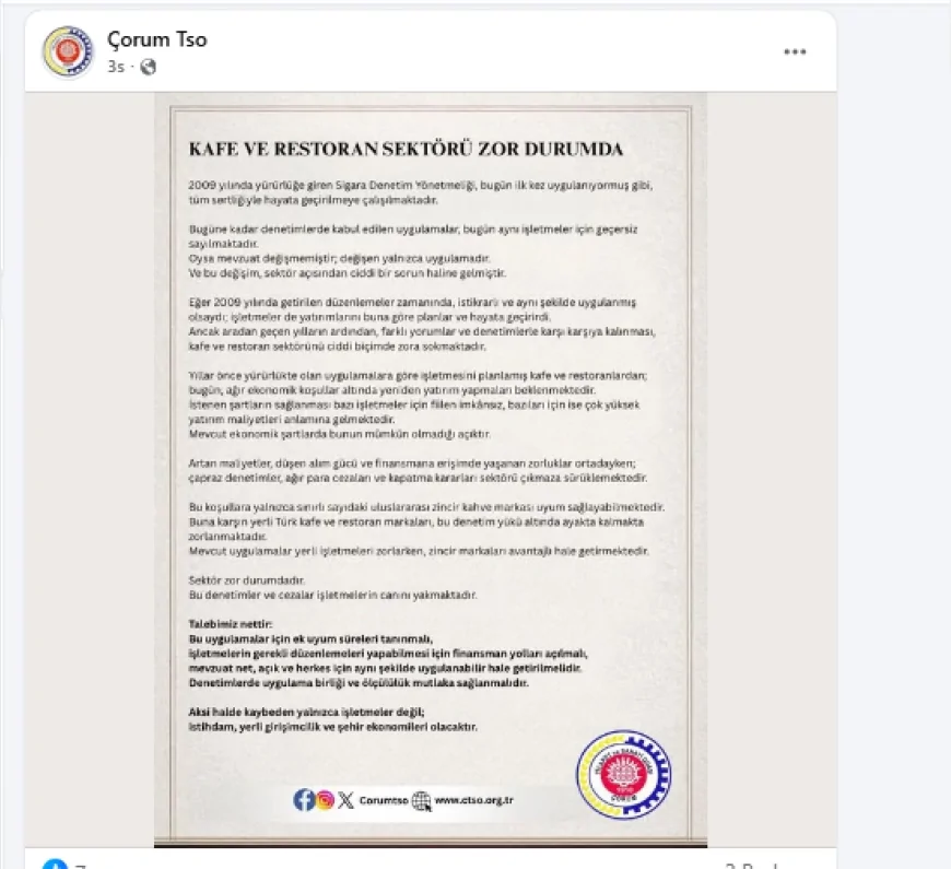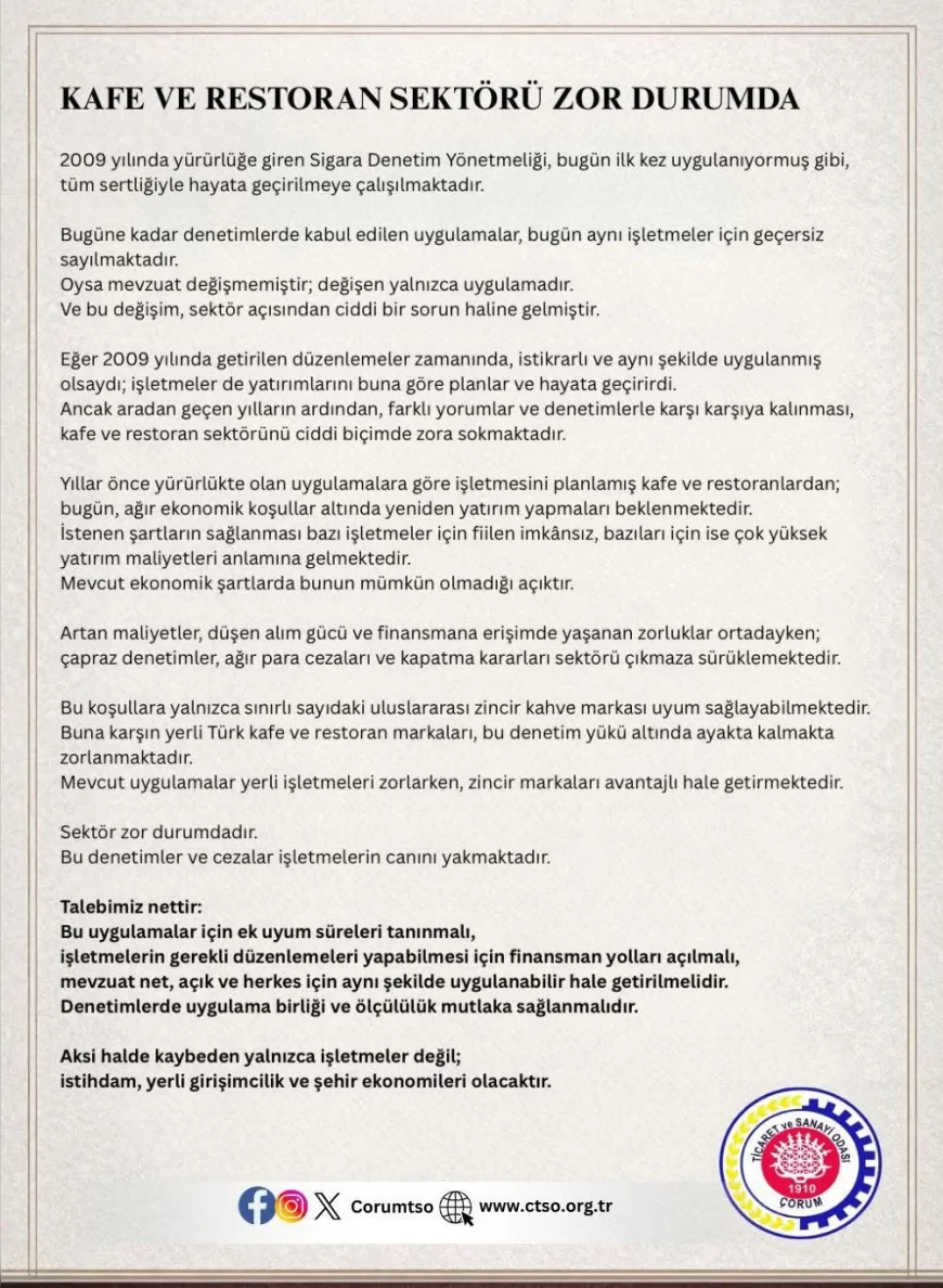 Çorum Ticaret ve Sanayi Odası, sosyal medya hesabından yaptığı açıklamada, sigara denetimleri kapsamında son dönemde artarak devam eden uygulamaların kafe ve restoran sektöründe ciddi mağduriyetlere yol açtığını bildirdi. Açıklamada, denetimlerin işletmeler üzerinde baskı oluşturduğu ifade edildi.