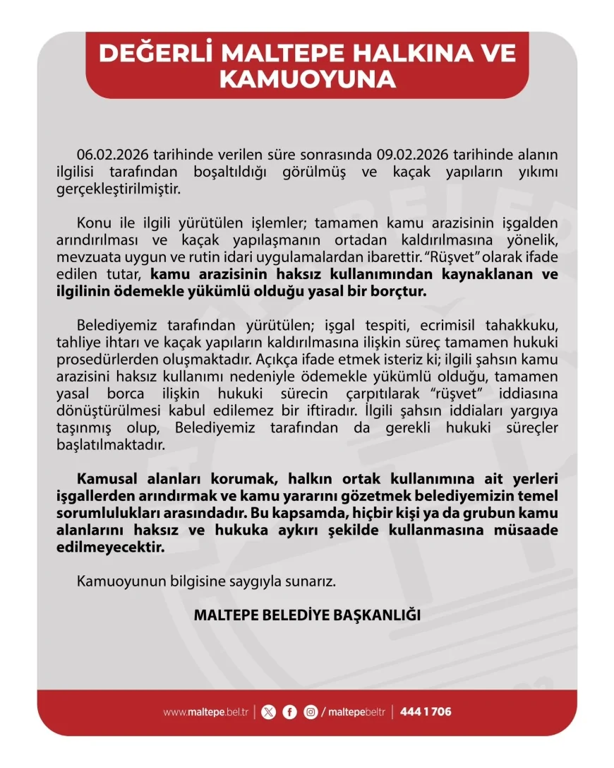 Maltepe Kaymakamlığı’nın 16 Ekim 2025 tarihli yazısı doğrultusunda işlem tesis edildiği belirtilen açıklamada, “4 Kasım 2025 tarihli ve 1100 sayılı Encümen Kararı ile 775 sayılı Gecekondu Kanunu’nun 18. maddesi uyarınca ruhsatsız yapıların kaldırılmasına karar verilmiştir.” denildi.