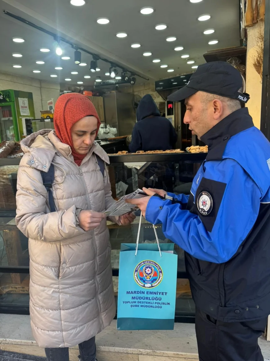 Mardin Emniyet Müdürlüğü Toplum Destekli Polislik Şube Müdürlüğü ekipleri, Artuklu ilçesinde esnaf ve vatandaşlarla buluşarak hırsızlık ve dolandırıcılık yöntemlerine karşı bilgilendirme çalışması yaptı. Etkinlikte KADES uygulaması tanıtıldı, broşürler dağıtıldı ve vatandaşlara birebir destek sağlandı.