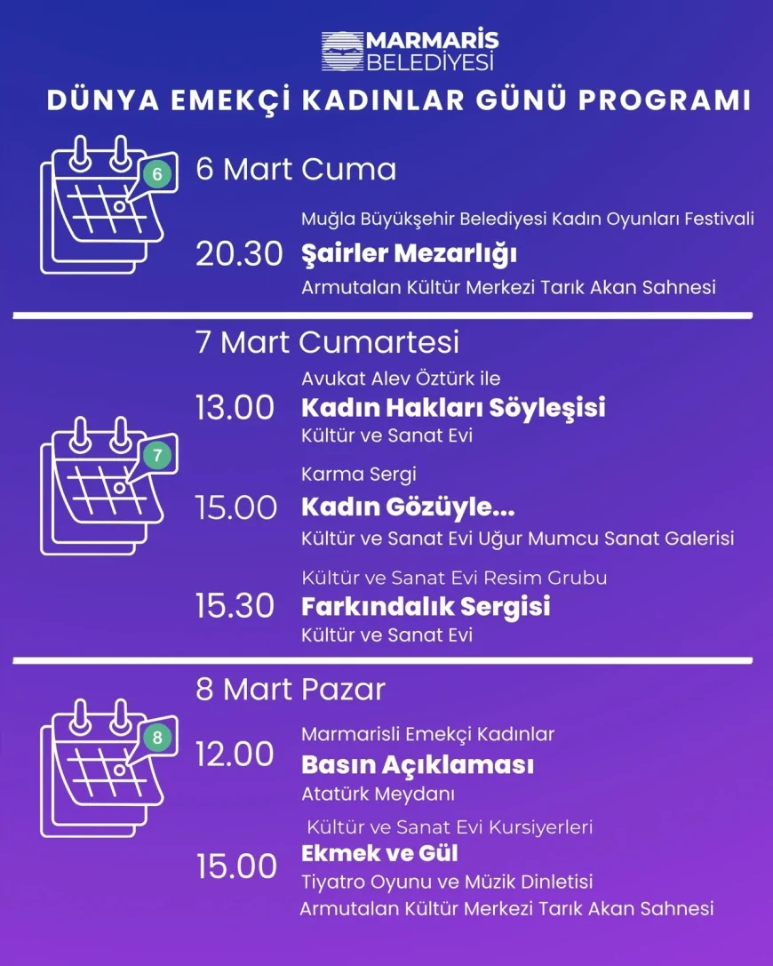 Marmaris Belediyesi öncülüğünde 6-7-8 Mart tarihlerinde düzenlenecek tiyatro gösterileri, söyleşiler, sergiler ve farkındalık etkinlikleriyle 8 Mart Dünya Emekçi Kadınlar Günü kapsamlı bir programla kutlanacak. Üç gün sürecek etkinliklerde kadın emeği, sanat ve toplumsal farkındalık ön plana çıkacak.