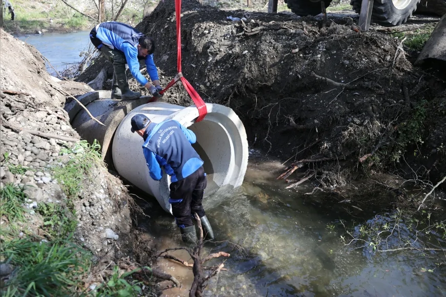 Sahada yapılan incelemelerde yağmur sularını dereye ileten ve yol geçişlerinde bulunan bazı büzlerin kapasite olarak yetersiz kaldığı tespit edildi. Yol güvenliğini ve tarım arazilerini olumsuz etkileyen bu durumun önüne geçmek amacıyla ekipler tarafından eski büzler çıkarılarak yerine daha büyük çaplı ve uygun kapasitede yeni büzler döşendi.