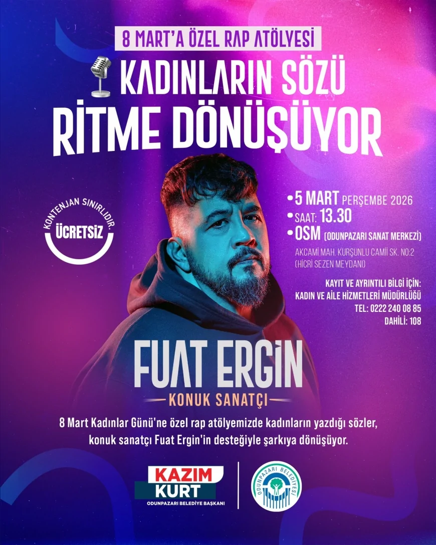 Odunpazarı Belediyesi, 8 Mart Dünya Emekçi Kadınlar Günü kapsamında kadınların duygu ve deneyimlerini müzikle ifade edebileceği özel bir rap atölyesi düzenliyor. Türk rap müziğinin önemli isimlerinden Fuat Ergin’in konuk sanatçı olarak katılacağı etkinlikte kadınların kaleminden çıkan sözler ritimle buluşacak.