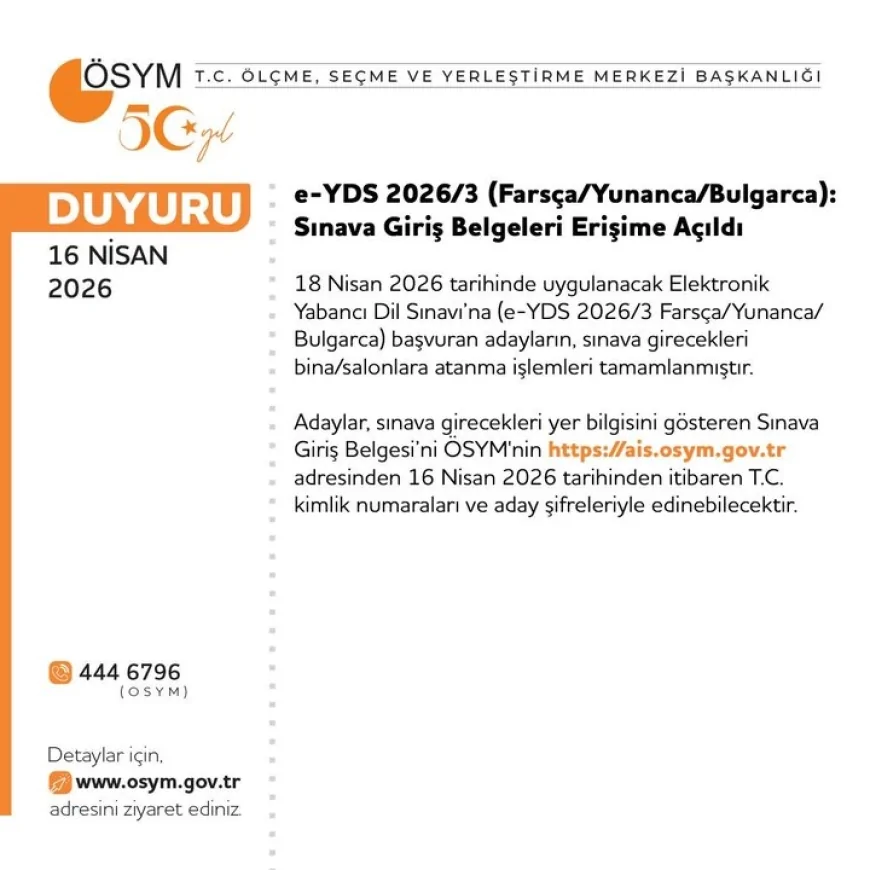 18 Nisan 2026 tarihinde yapılacak e-YDS 2026/3 (Farsça/Yunanca/Bulgarca) sınavına ilişkin giriş belgeleri de erişime açıldı. ÖSYM, adayların sınav yerlerini gösteren belgeleri 16 Nisan saat 11.15’ten itibaren alabileceğini bildirdi.