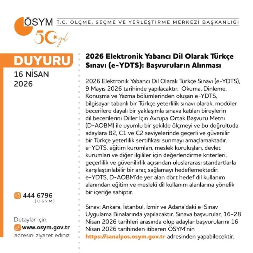 ÖSYM ayrıca, 9 Mayıs 2026 tarihinde yapılacak Elektronik Yabancı Dil Olarak Türkçe Sınavı (e-YDTS) için başvuru sürecinin başladığını duyurdu. Başvuruların 16-28 Nisan tarihleri arasında alınacağı belirtildi.