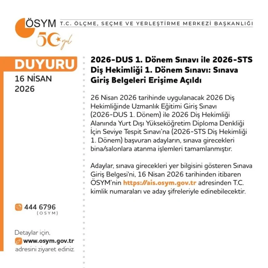 26 Nisan 2026’da yapılacak 2026-DUS 1. Dönem ve 2026-STS Diş Hekimliği 1. Dönem sınavlarına ilişkin giriş belgeleri de yayımlandı. Adaylar belgelerine 16 Nisan saat 14.30’dan itibaren erişebiliyor.